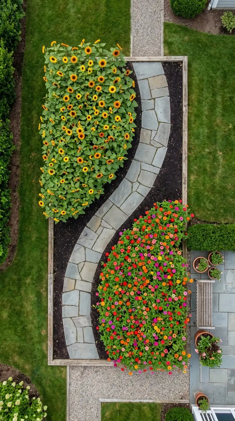 A single long rectangular bed (say, 4×20 feet) with a curved flagstone path cutting through it, creating two crescent-shaped planting zones. This softens the formal rectangle and makes a narrow space feel larger and more inviting.