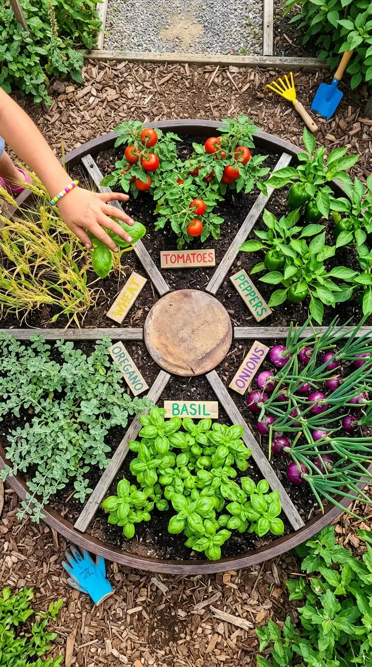 A circular bed divided into wedges, each wedge growing a pizza ingredient: tomatoes (sauce), peppers (topping), onions (topping), basil (garnish), oregano (seasoning), and wheat (for crust in theory). A small round pa stone sits in the center as a “table.”