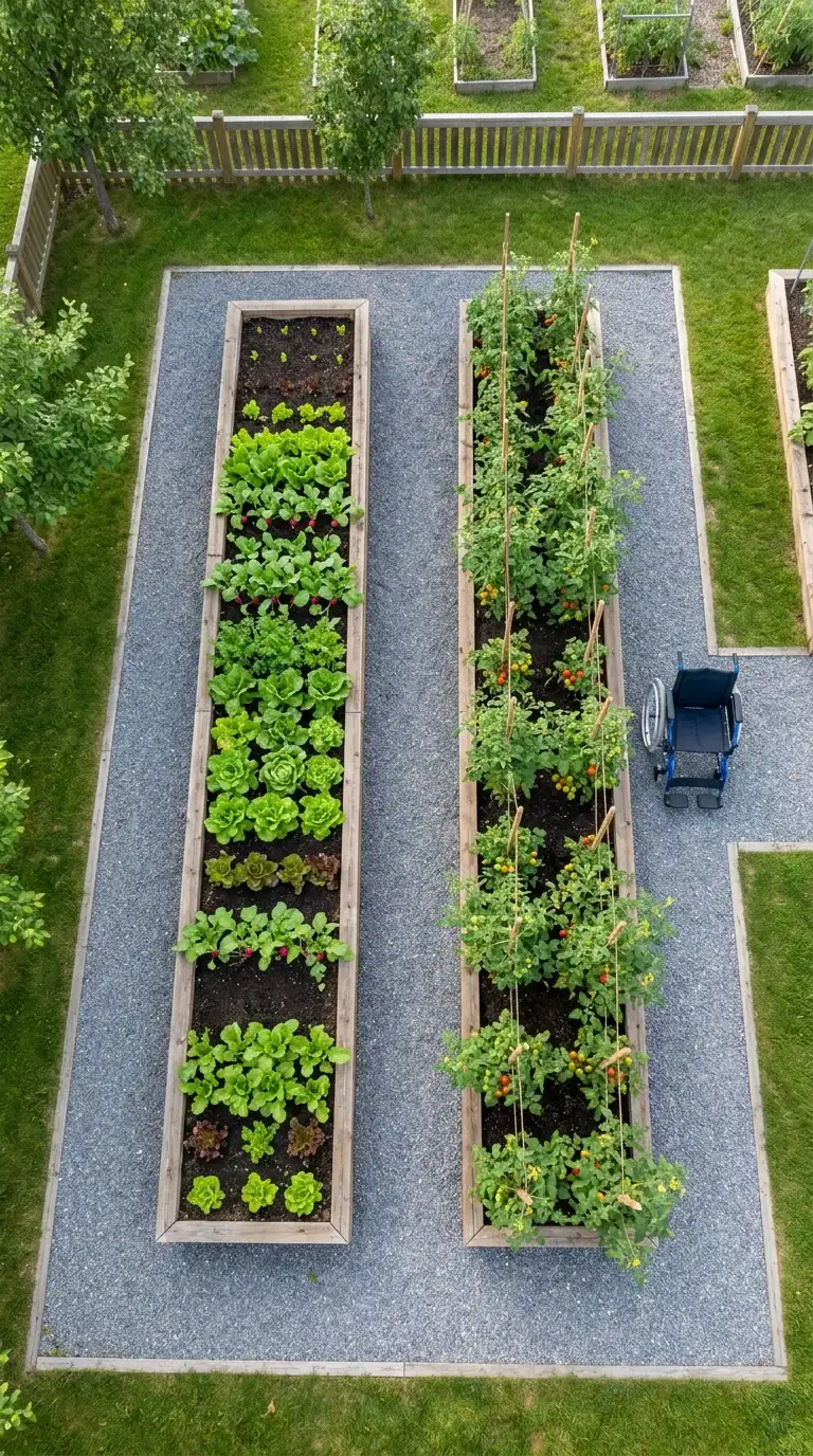 Designed for wheelchairs, walkers, or anyone who prefers not to bend deeply. Beds are raised to 30 inches tall. Paths are a full 4 feet wide. Beds are narrow (2 feet deep) so everything can be reached from either side. No kneeling required.