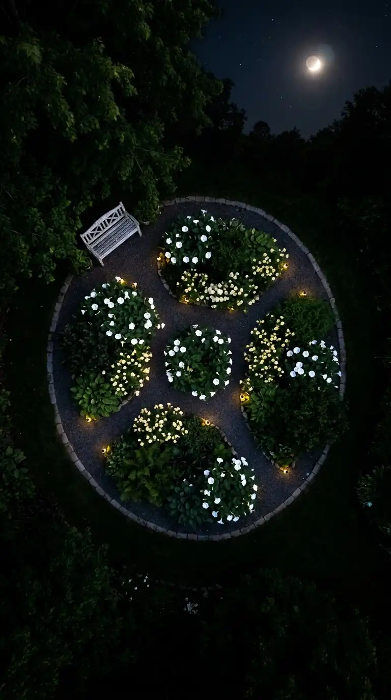 A circular or kidney-shaped bed planted entirely with white or pale flowers that reflect moonlight and open in the evening. Evening primrose, moonflower vine, night-blooming jasmine, and white nicotiana. Place it near a patio or bedroom window.
