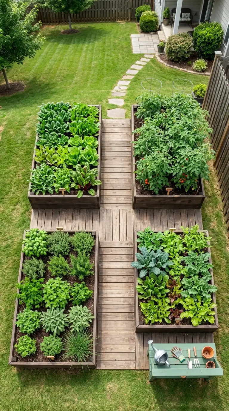 Four identical 4×8 foot raised beds arranged in a simple grid with 2-foot paths between them. This layout maximizes growing space while keeping every bed within arm’s reach. Perfect for beginners. Add a small tool bench at one end.