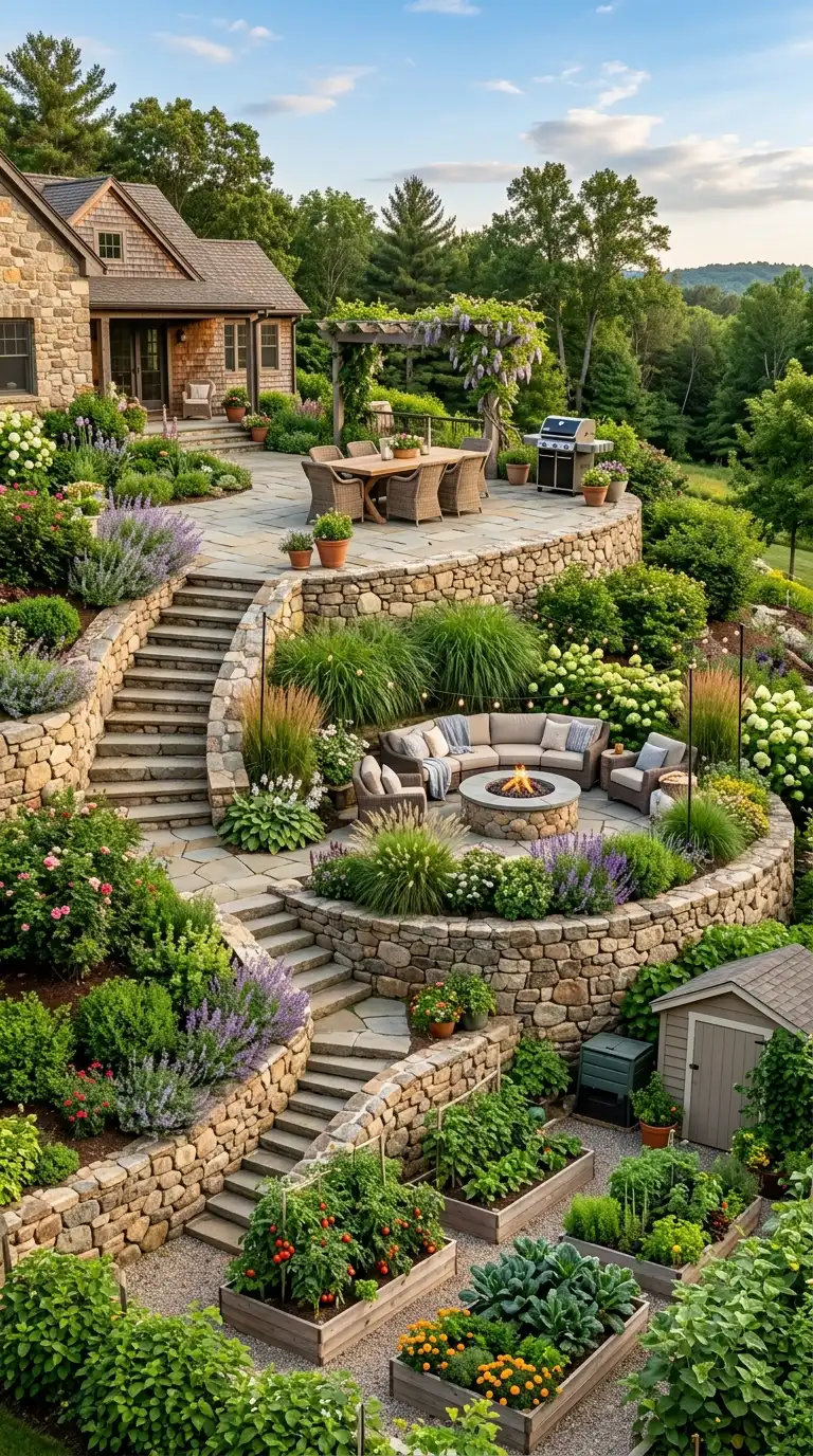 For sloped backyards, a terraced design uses retaining walls to create flat, usable levels. Each terrace can serve a different purpose—a dining area on one level, a lounge area on another, and a garden on the lowest level. Use stone or timber retaining walls, and connect the levels with steps and pathways. A terraced landscape maximizes usable space on challenging terrain.
