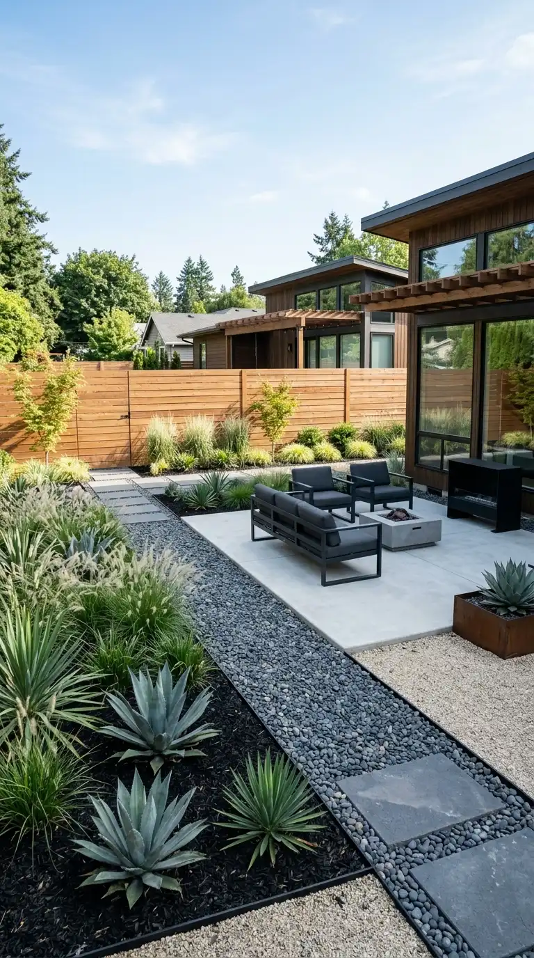 Modern minimalist landscaping emphasizes clean lines, a restrained material palette, and simplicity. Use geometric hardscaping—rectangular patios, square stepping stones, and angular retaining walls. Choose a limited selection of materials like concrete, wood, and gravel. Plantings are often massed in drifts of ornamental grasses, succulents, or low ground covers. The result is a calm, uncluttered outdoor space that complements contemporary architecture.