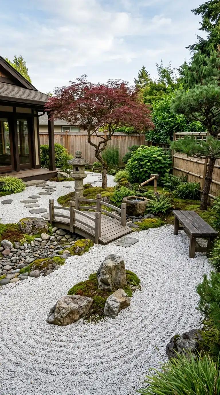 Create a tranquil retreat with a Japanese-inspired Zen garden. Use gravel or sand raked in patterns to represent water, and arrange rocks and boulders to suggest mountains. Plant bamboo, Japanese maples, moss, and evergreens. Include a water feature like a small pond or bamboo fountain, and a simple wooden bench for meditation. A Zen garden offers a quiet space for reflection and mindfulness.