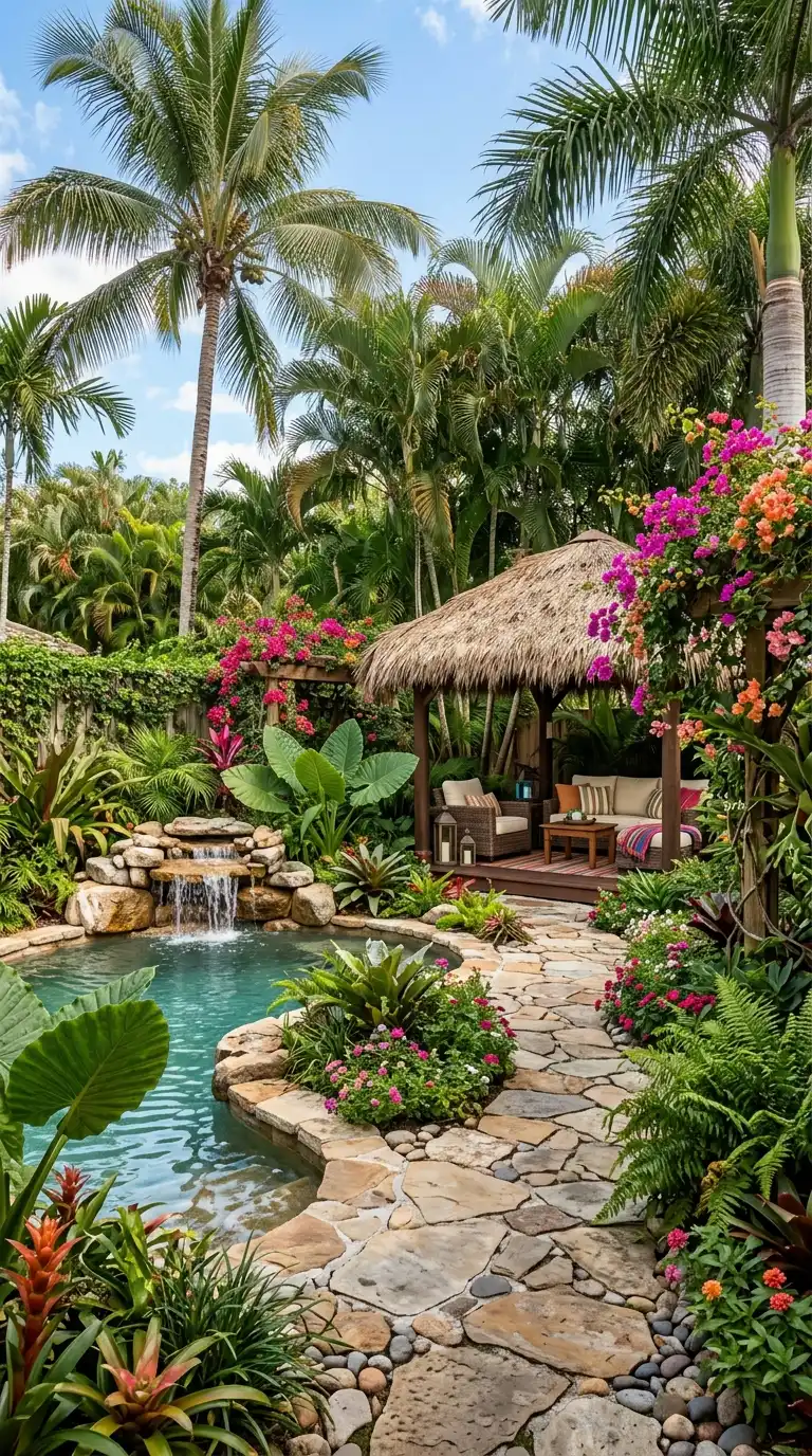 Transform your backyard into a lush tropical escape with large-leaf plants like elephant ears, banana trees, and birds of paradise. Add palms, ferns, and flowering vines for depth and texture. Use natural materials like stone, wood, and thatch for structures. Incorporate a water feature, a pool, or a hot tub to enhance the resort-like feel. A tropical landscape creates a sense of vacation and relaxation year-round.