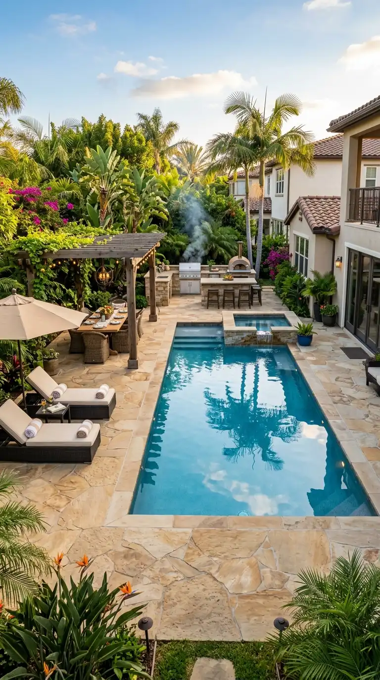 Design your backyard around a swimming pool as the central feature. Position the pool to capture sun and views, and arrange seating, dining, and lounging areas around it. Use decking or paving to create a cohesive surface, and add landscaping to soften the edges and provide privacy. A pool-centric design creates a resort-like atmosphere ideal for relaxation and entertaining.