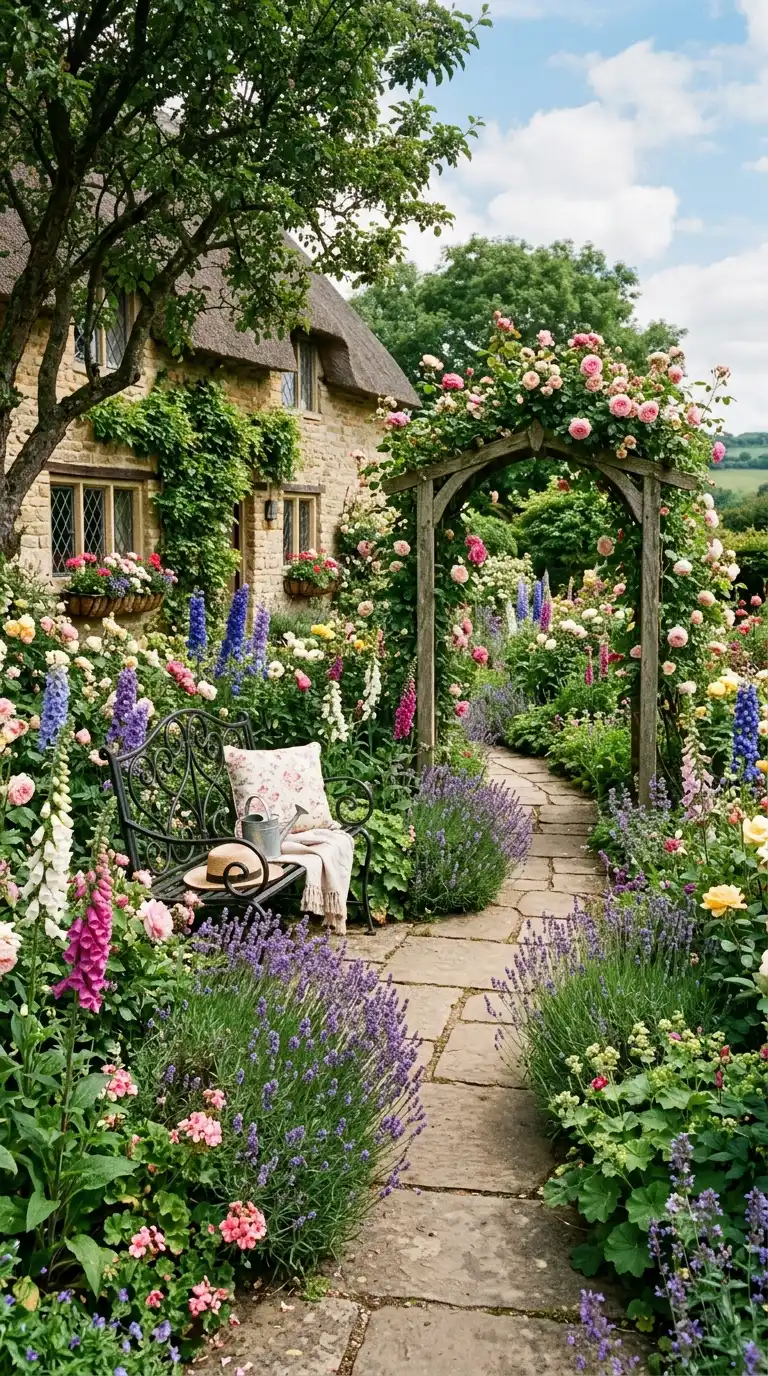 A cottage garden embraces abundance, color, and a relaxed, informal aesthetic. Plant a mix of perennials, annuals, and flowering shrubs in layered drifts. Include classic cottage plants like roses, delphiniums, foxgloves, peonies, and lavender. Allow plants to spill over pathways, and incorporate climbing vines on arbors and trellises. A cottage garden feels romantic, nostalgic, and full of life.