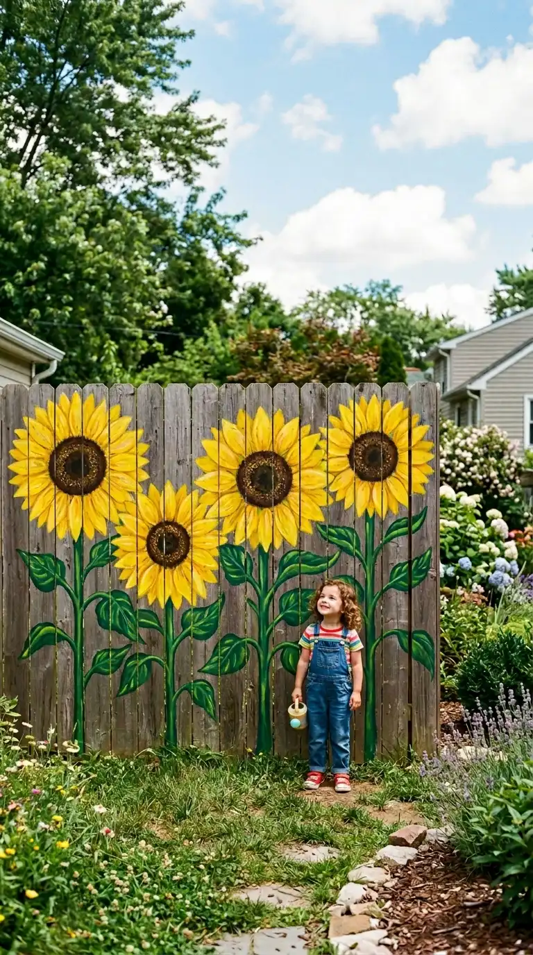 Paint giant sunflowers (taller than a person) against a bright blue sky. Add a few painted bees or butterflies. The cheerful, oversized scale makes a small yard feel playful and whimsical. Let the sunflowers face the actual sun.