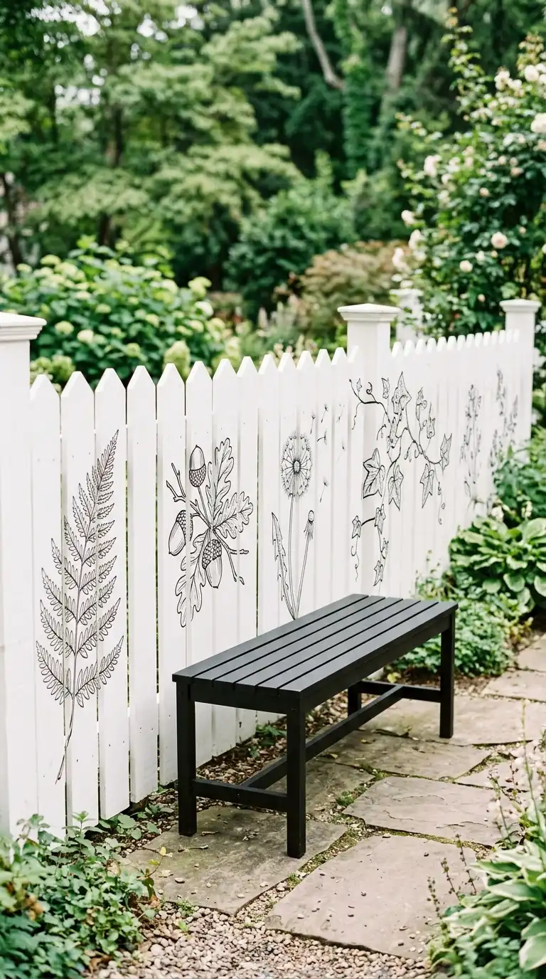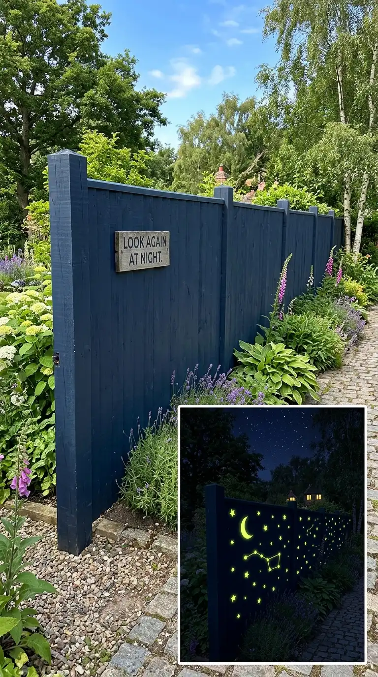 Paint a deep navy blue or black night sky across your fence. Then add glow-in-the-dark paint stars, moons, and constellations. During the day, it’s a dark wall. At night, the stars emerge. Add a painted silhouette of pine trees or a crescent moon.