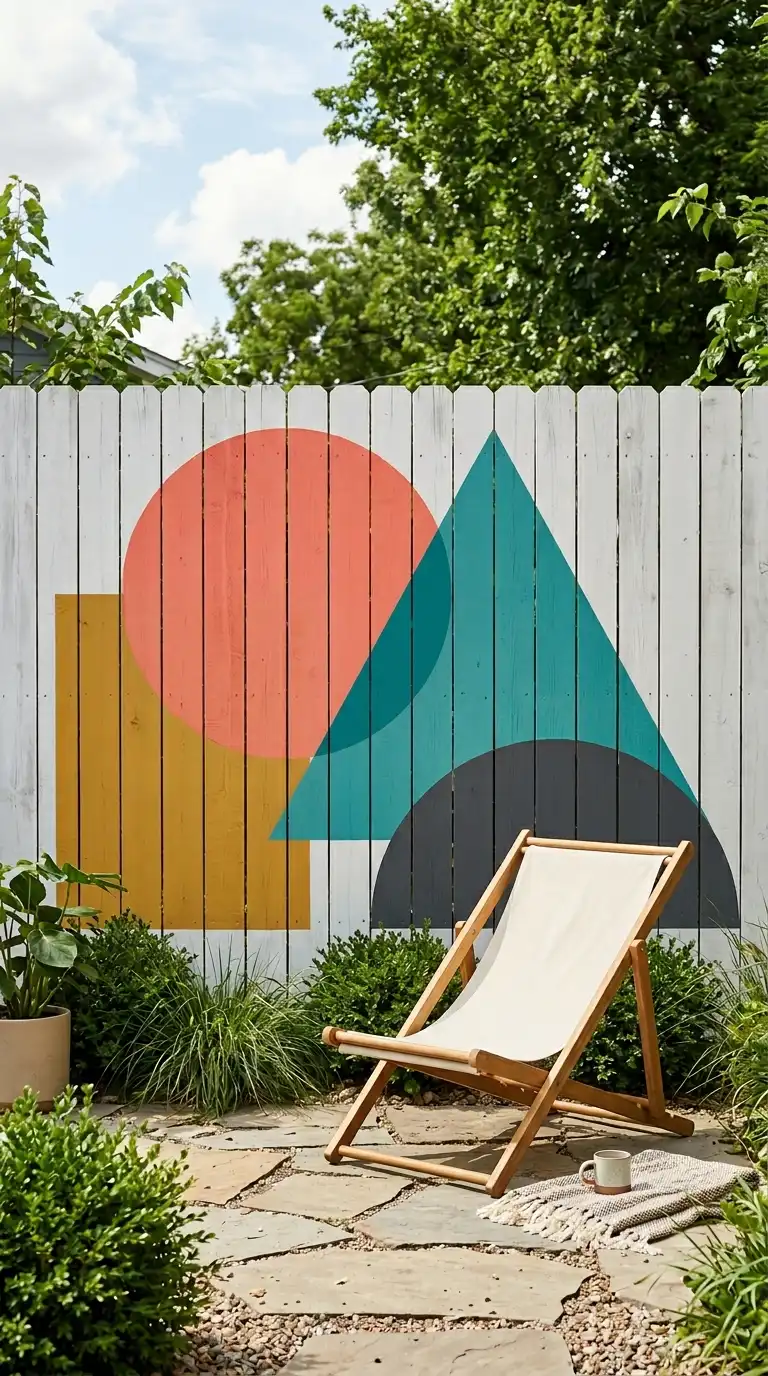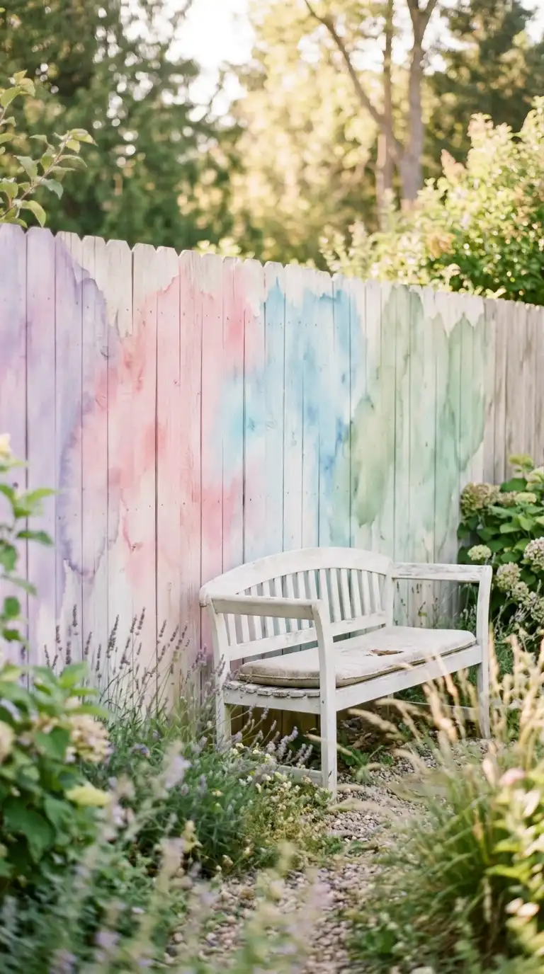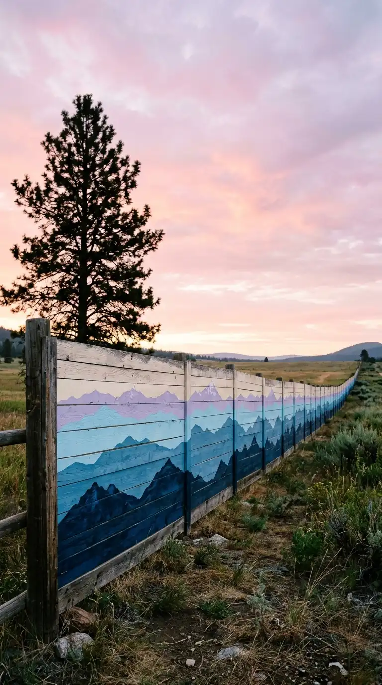 Paint a layered mountain range across your fence. Use shades of blue, purple, and grey, getting lighter with each layer back. Add a pale yellow or pink sky. The mural creates depth and horizon, making a narrow yard feel vast.