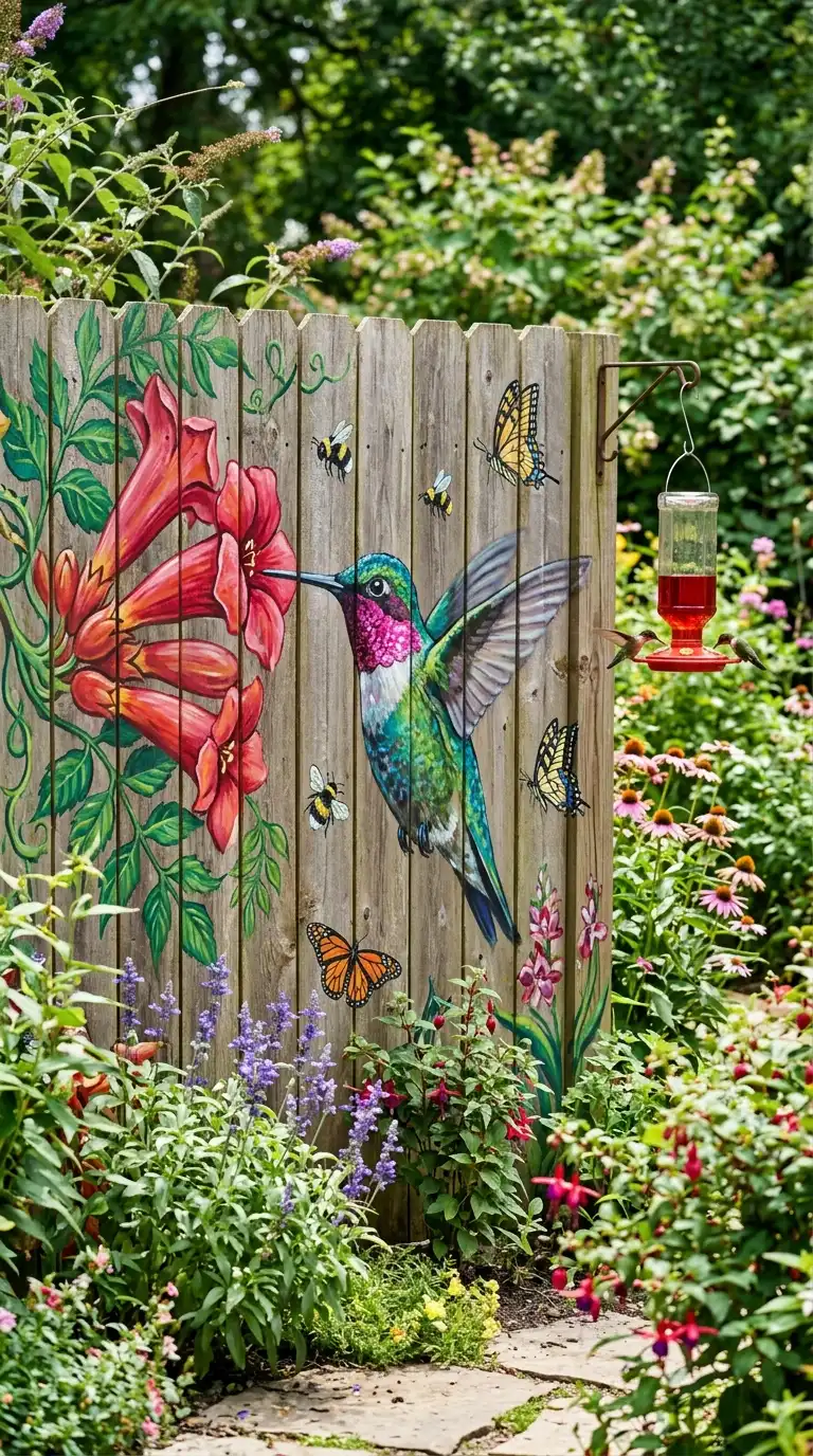 Paint a single giant hummingbird hovering near an equally giant trumpet flower or bee balm. Use iridescent paint for the bird’s throat. The scale makes a small yard feel like a storybook. Add a few smaller painted bees or butterflies.