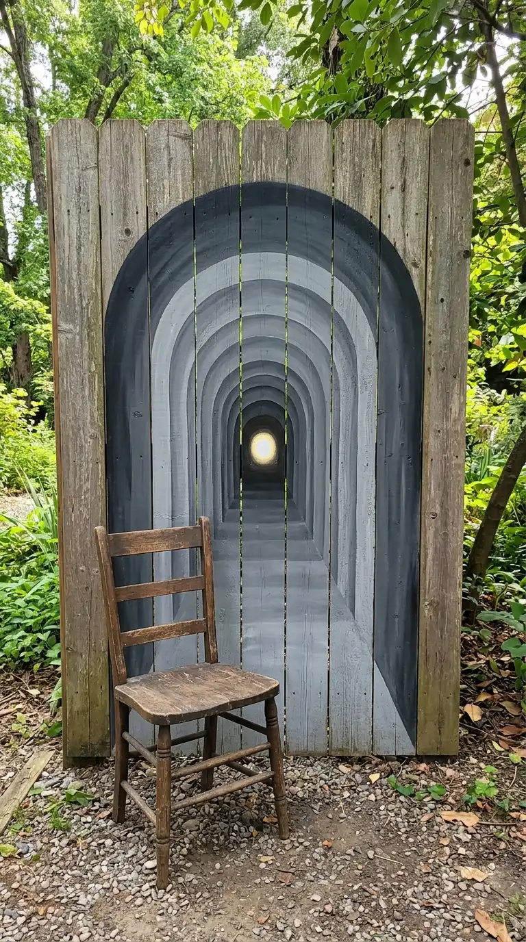 Paint a false tunnel or archway that appears to go through your fence. Use forced perspective: a dark opening with lighter walls receding to a small bright circle at the center. The illusion makes a shallow yard feel deep. Stand a real chair in front of the “entrance.”