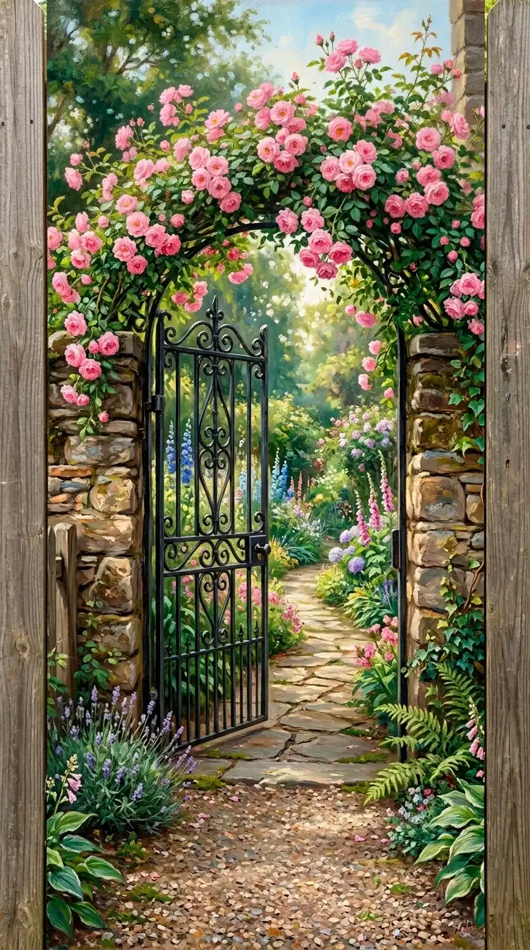 Paint a false iron gate set into a stone wall. Add climbing roses or wisteria spilling over the top. The mural suggests a hidden garden just beyond. Place it at the far end of a narrow yard to create the illusion of depth and mystery.