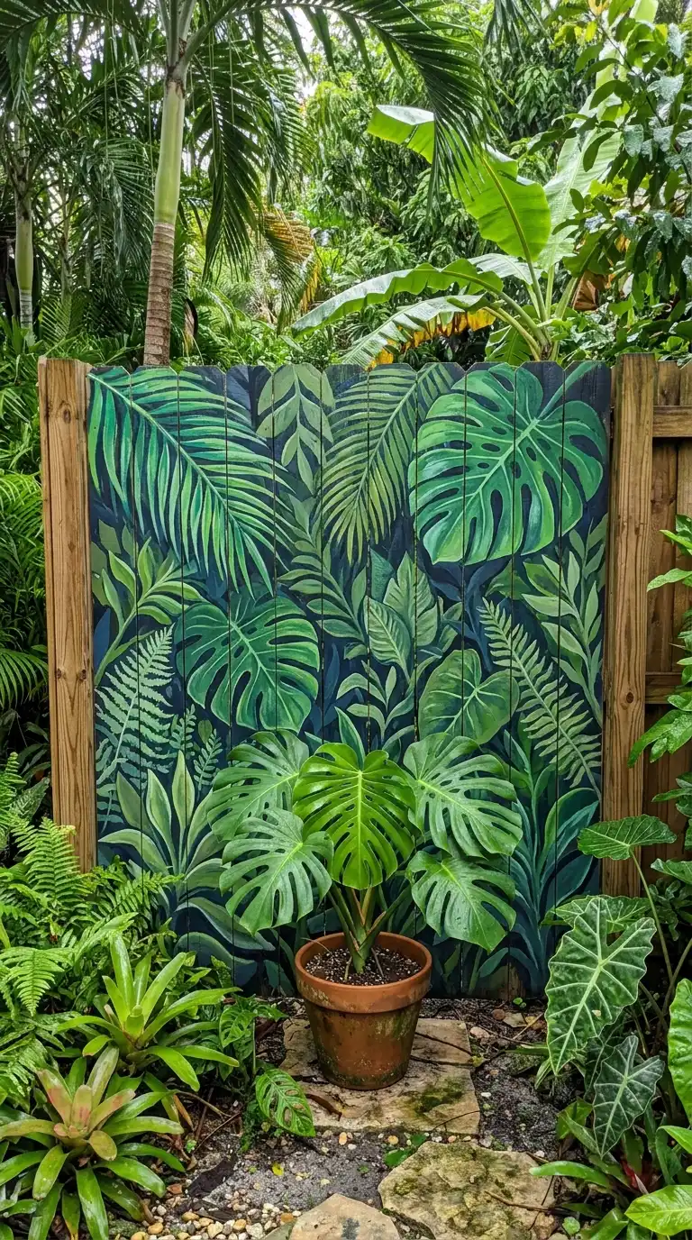 Paint oversized monstera leaves, ferns, and palm fronds across a fence or wall. Use multiple shades of green with deep blue-black shadows. The mural creates the illusion of a dense jungle behind your actual plants. No watering required.