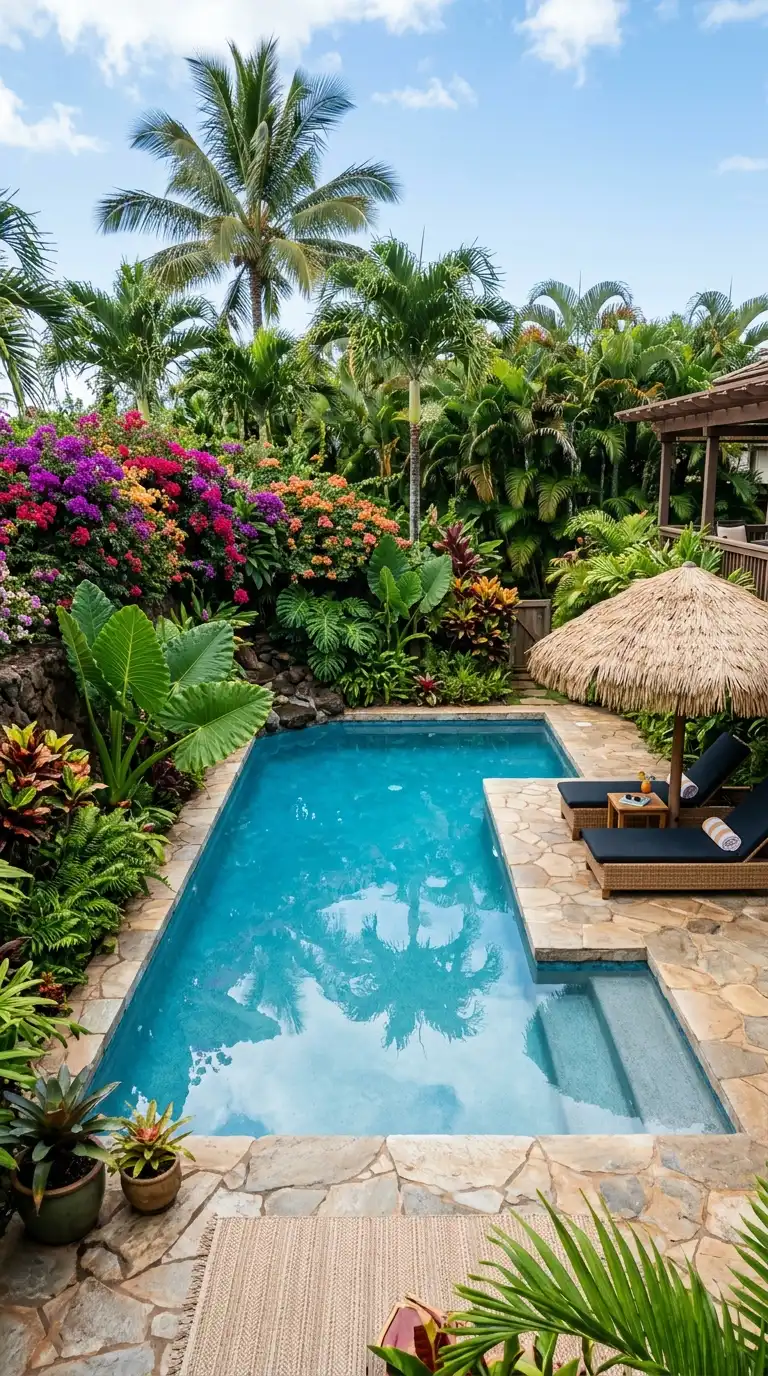 Create a resort-like atmosphere with lush tropical landscaping around your pool. Use large-leaf plants like elephant ears, banana trees, and birds of paradise. Add palms, ferns, and flowering vines for depth and texture. Use natural stone or wood decking, and add a thatched umbrella or cabana for shade. The dense, green plantings create privacy and a sense of being on vacation.