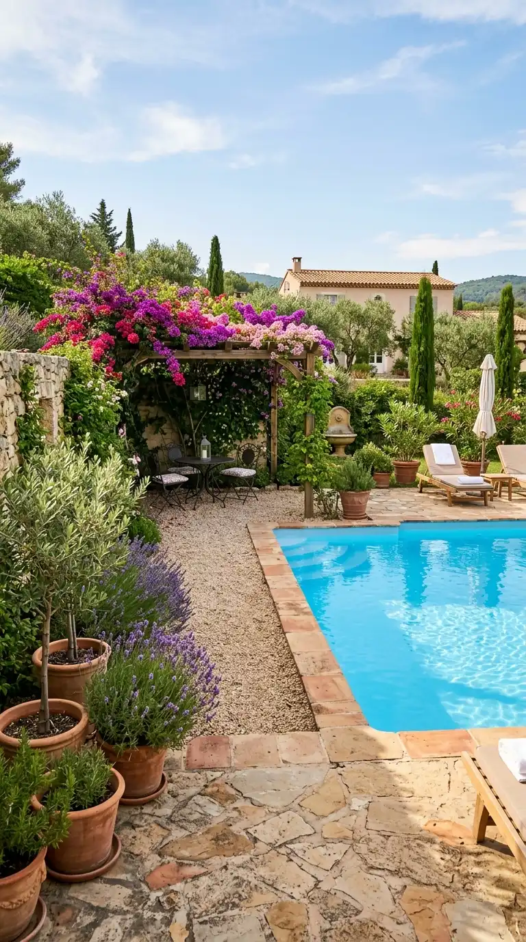 Bring the warmth of the Mediterranean to your pool area with terracotta pots, olive trees, lavender, and gravel pathways. Use warm stone or tile for the pool deck. Add a pergola draped with climbing vines, and place wrought iron furniture with colorful cushions nearby. Plant rosemary, bougainvillea, and citrus trees in large pots. The landscape feels sun-drenched, inviting, and elegant.