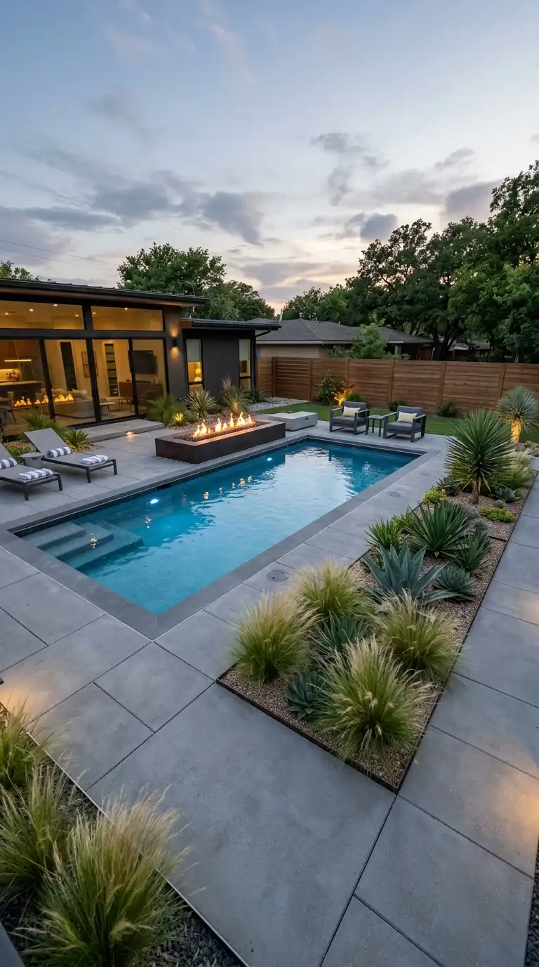 A modern minimalist landscape emphasizes clean lines, a restrained color palette, and uncluttered surfaces. Use large-format concrete pavers for the pool deck, and plant ornamental grasses, succulents, and agave in geometric patterns. Keep the color palette neutral—gray, white, and green. Add a few sculptural elements like a single water feature or a linear fire pit. The result is calm, sophisticated, and uncluttered.