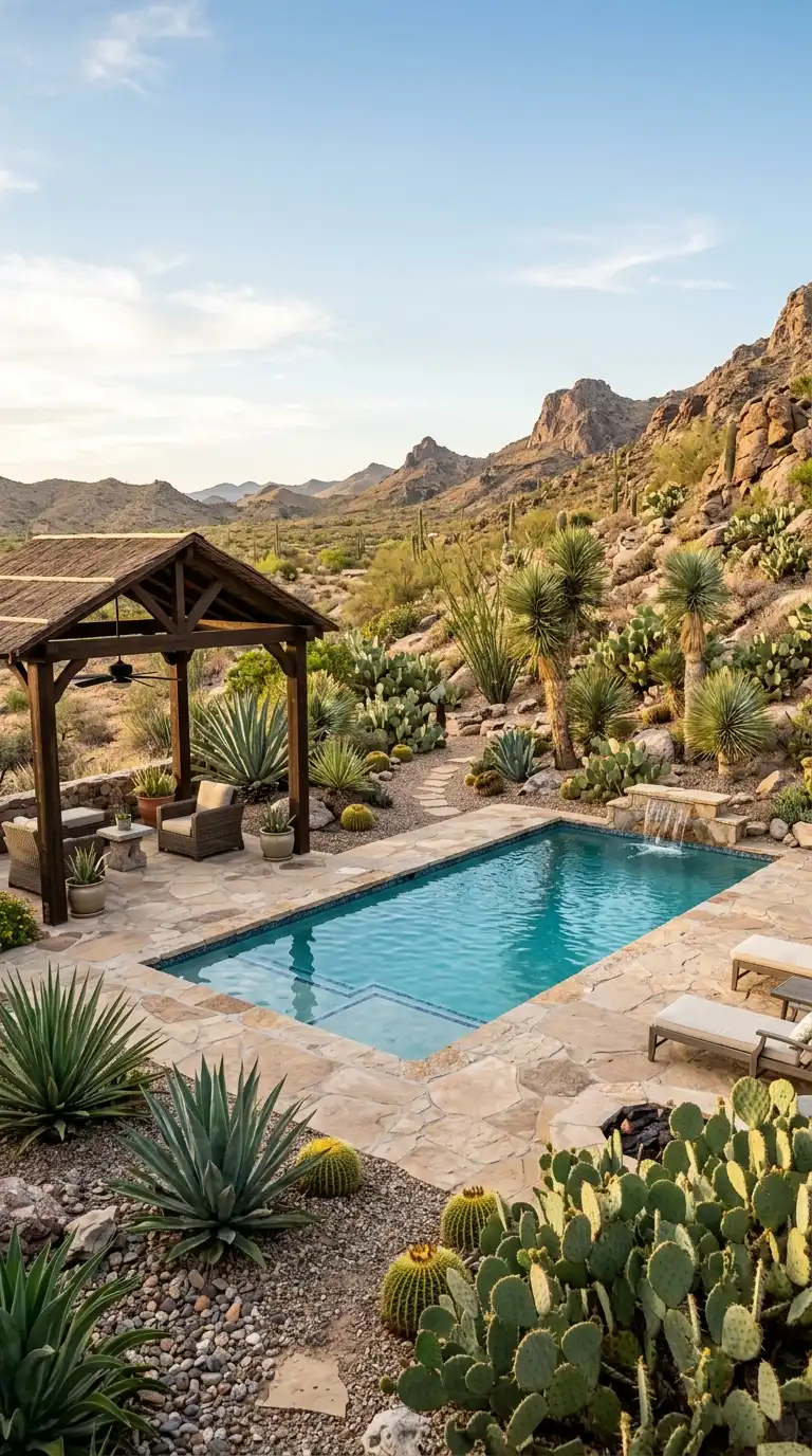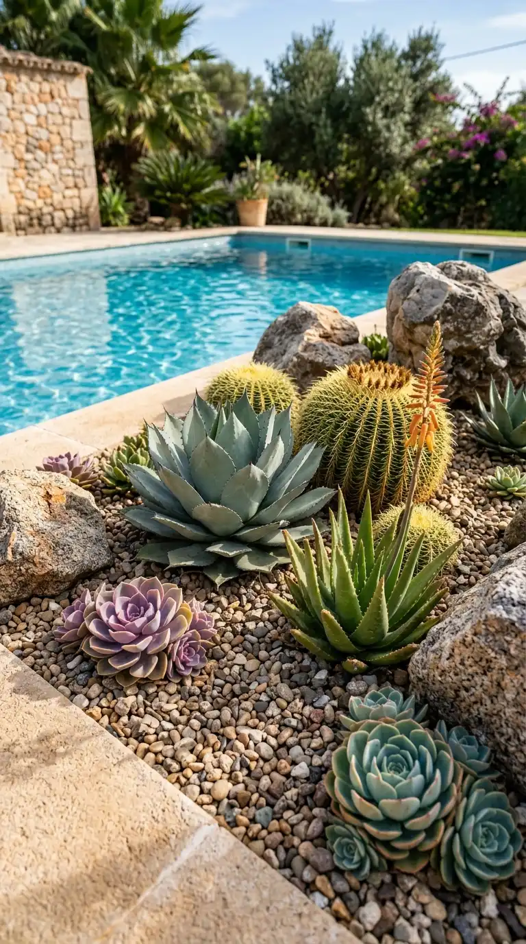 For a low-maintenance, sculptural landscape, plant succulents and cacti around your pool. Use agave, aloe, echeveria, barrel cactus, and prickly pear. Plant them in gravel or decomposed granite beds. Add large boulders for interest. The landscape is dramatic, architectural, and requires very little water.