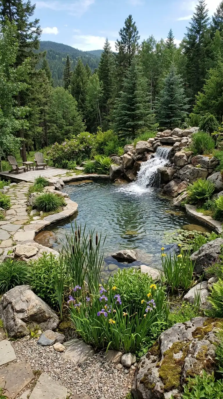 Blur the line between pool and nature with a naturalistic pond-style landscape. Use irregular-shaped pools with rock edges, boulders, and pebble tec finishes. Plant moisture-loving plants like cattails, rushes, water irises, and water lilies. Add a waterfall or stream that flows into the pool. The landscape should feel like a natural mountain pond, not a man-made structure.