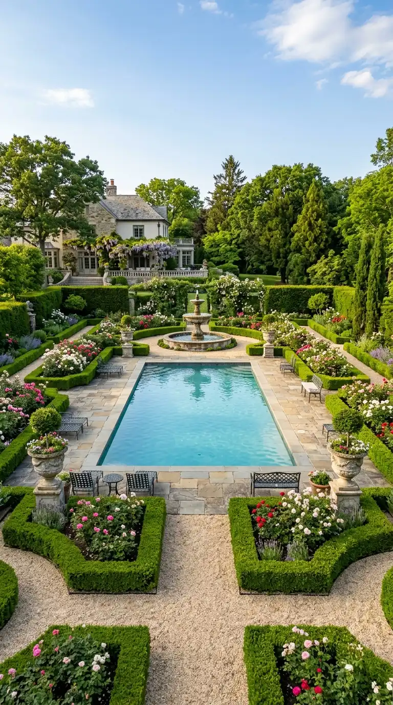A formal garden around a rectangular or geometric pool creates an elegant, timeless look. Use clipped hedges (boxwood or privet) to create symmetry and structure. Plant roses, lavender, and topiaries in formal beds. Use stone or brick for the pool deck, and add urns or statues as focal points. A central fountain or reflecting pool enhances the formal aesthetic.