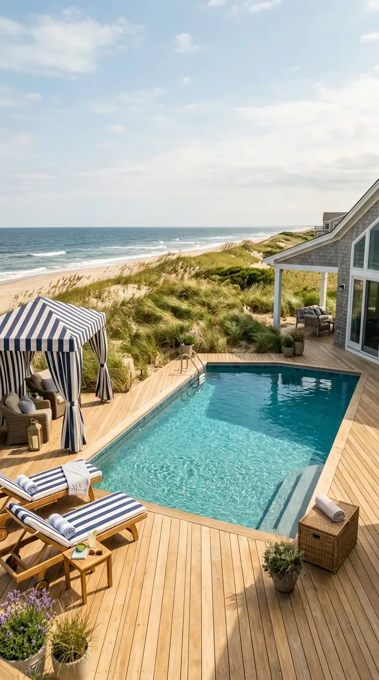 Bring the beach to your backyard with a coastal-style landscape. Use light, sandy colors for the pool deck—blonde wood, light stone, or sand-colored pavers. Plant beach grasses, sea oats, and low-growing succulents. Add a cabana with striped canvas, lounge chairs with blue and white cushions, and a outdoor shower. Use rope details, driftwood, and shells as accents.