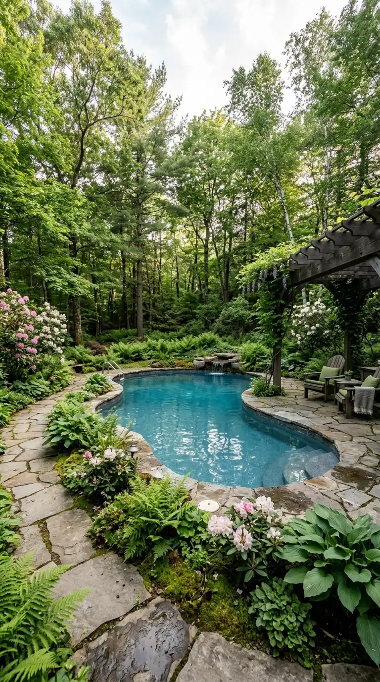 If your pool is surrounded by trees, lean into the woodland aesthetic. Use natural stone for the pool deck, and plant ferns, hostas, astilbe, and rhododendrons. Add a wooden pergola or a rustic bridge over a stream. Use earthy colors—brown, green, and gray. The landscape feels cool, shaded, and peaceful, perfect for hot summer days.