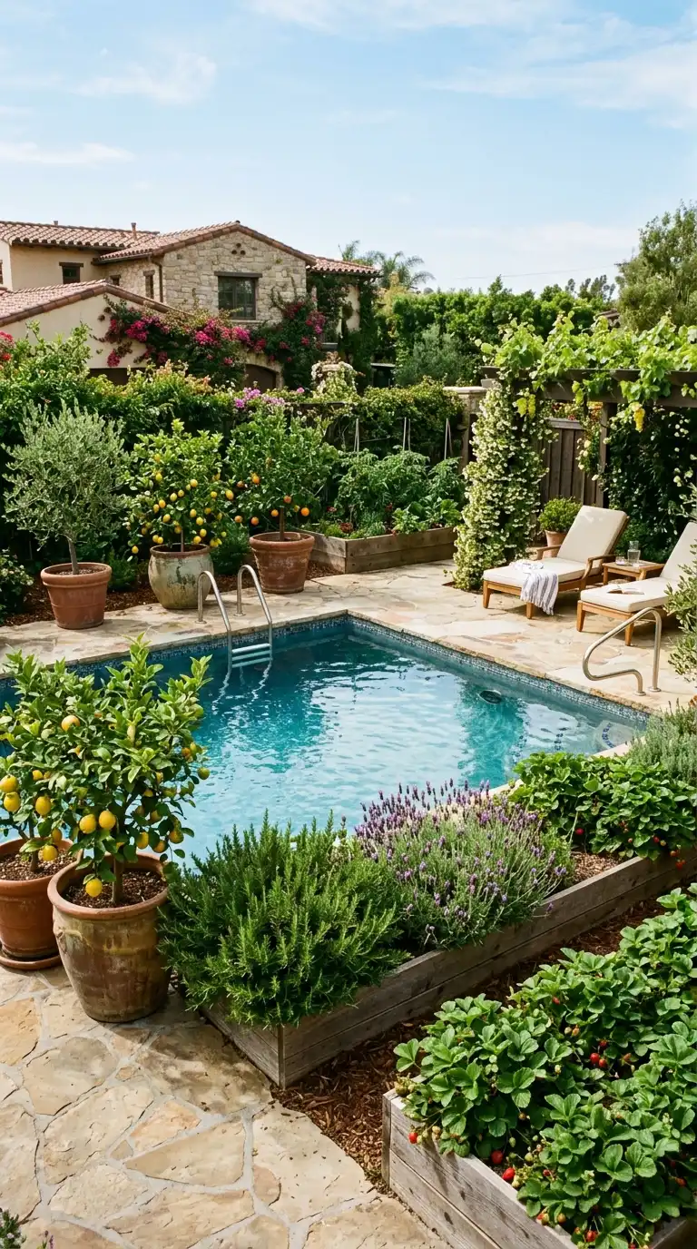 Combine beauty and utility by planting edible plants around your pool. Use citrus trees, olive trees, rosemary, lavender, thyme, and strawberry plants. Plant them in raised beds or large pots. The fragrance and color add to the sensory experience, and you can harvest fresh herbs and fruit while lounging by the pool.
