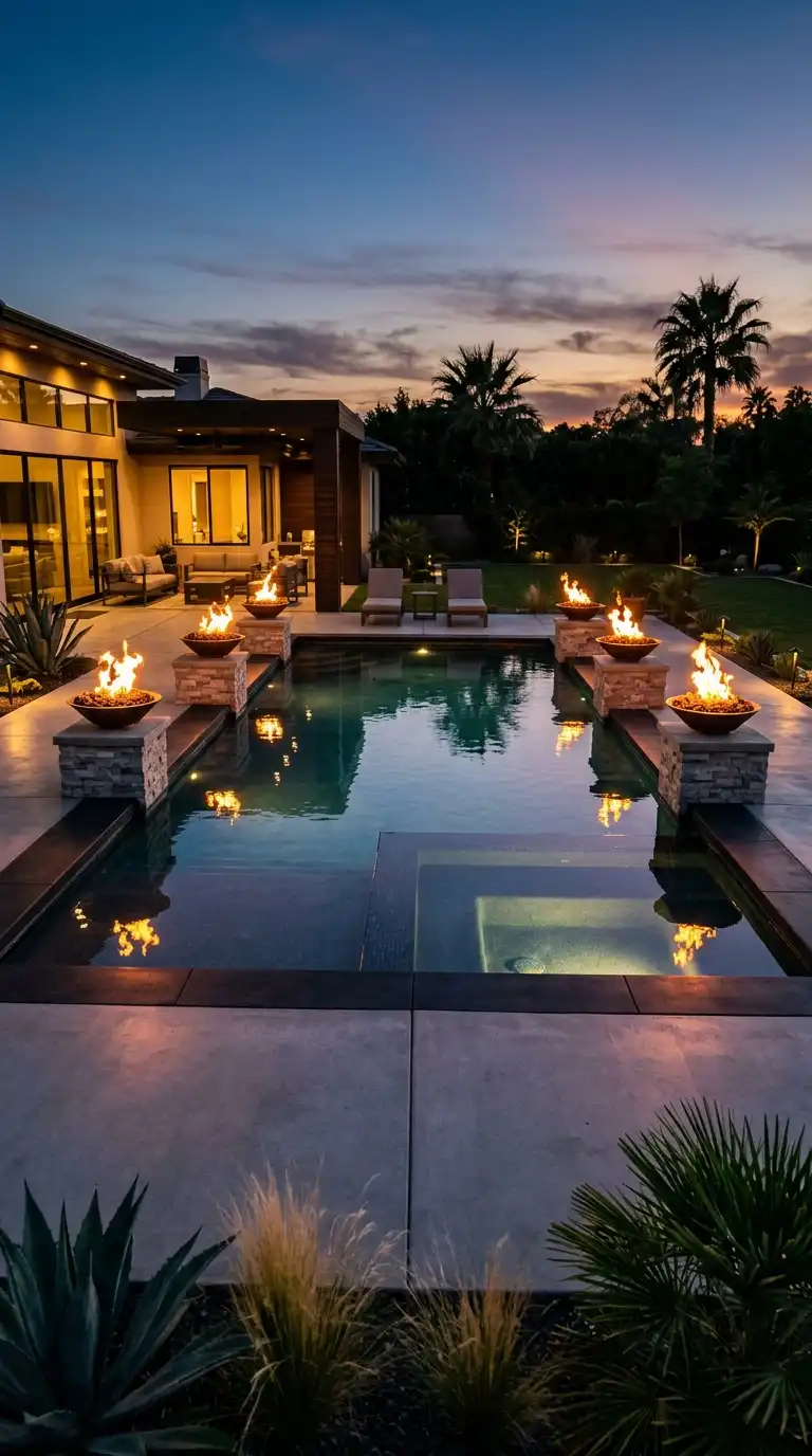 Combine the elements of fire and water for a dramatic landscape. Place fire bowls, a fire pit, or a linear fire feature near the pool. The flames reflect off the water, creating a stunning visual contrast. Use stone or concrete for the hardscaping, and keep plantings simple and architectural. The landscape is especially striking at dusk.