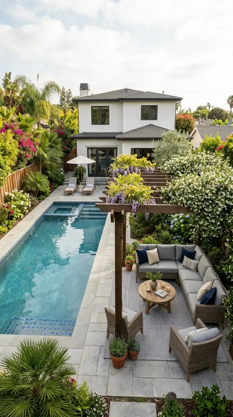 Extend your pool deck into an outdoor living room with comfortable seating, an outdoor rug, and a pergola. Use weather-resistant sofas, armchairs, and a coffee table. Add an outdoor kitchen or bar nearby. Plantings should be lush but restrained, framing the living area rather than overwhelming it. The pool becomes a backdrop for socializing.