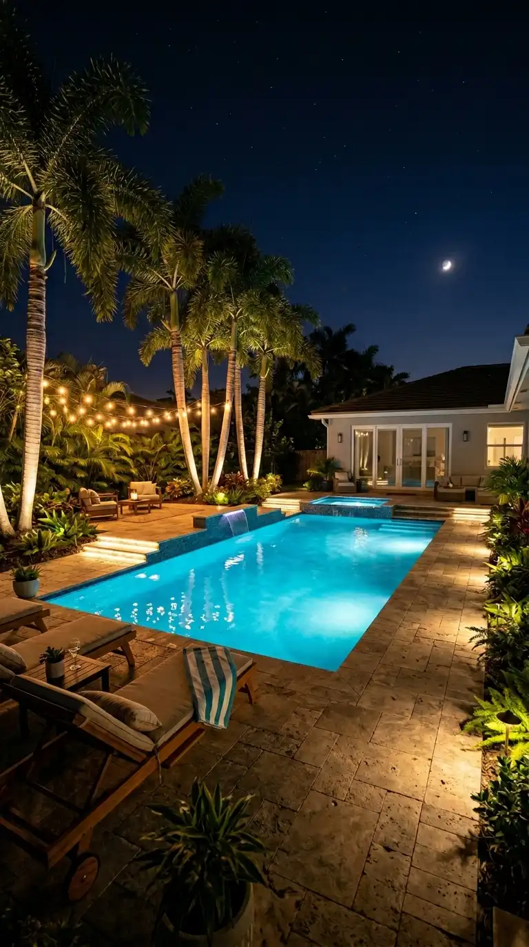 Landscape lighting transforms your pool area into a magical evening retreat. Use underwater LED lights to illuminate the pool itself. Add uplights to highlight trees and architectural features. Use path lights to guide movement, and place candles or lanterns on tables. String lights overhead create a warm canopy. Layered lighting adds depth, drama, and a sense of enchantment.