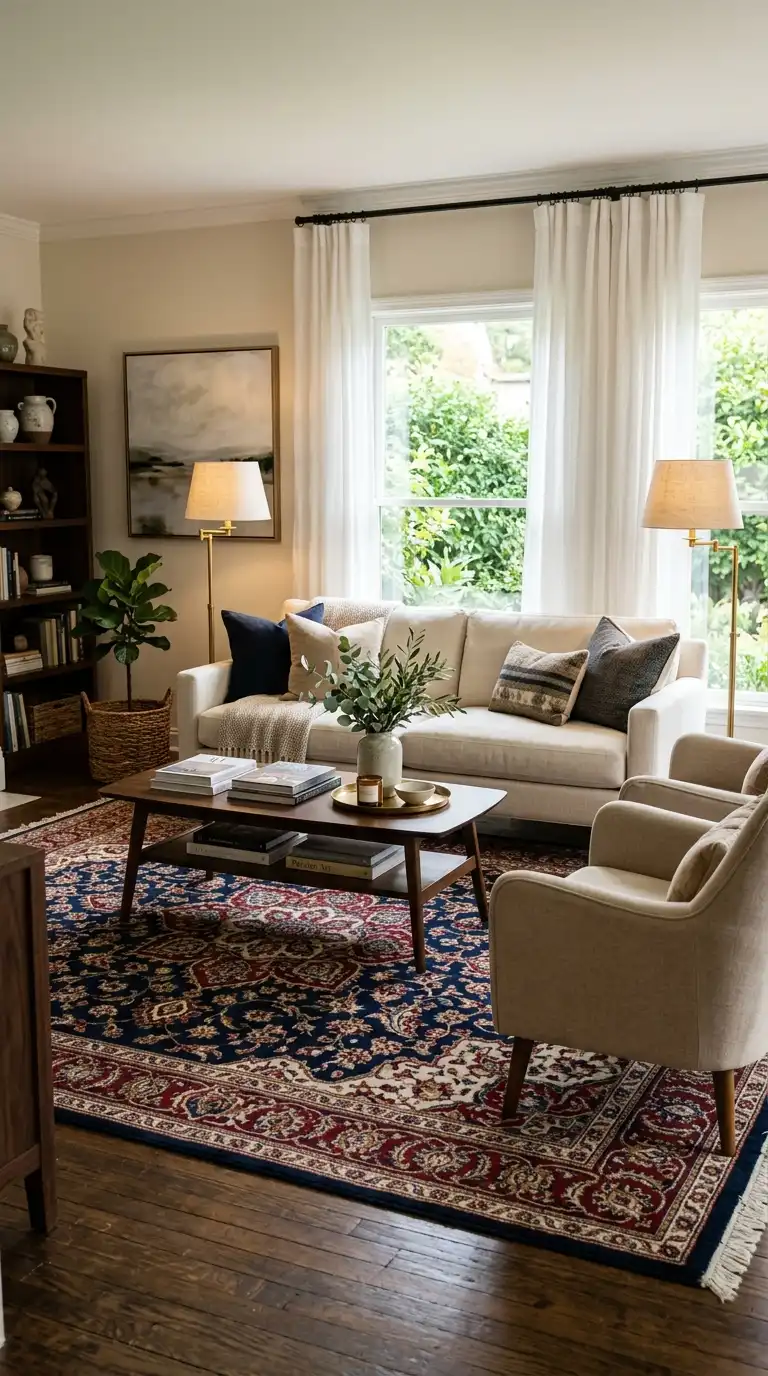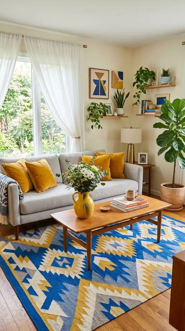 A rug that combines blue and yellow brings vibrant energy and cheerful contrast to a living room. The complementary colors create visual excitement while remaining balanced. Pull the yellow into accent pillows, throws, or artwork, and keep larger furniture neutral to let the rug lead the color story.