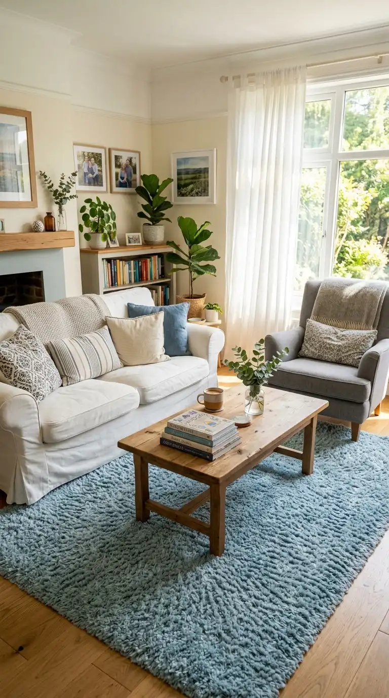 A light blue shag rug adds texture, softness, and a sense of casual comfort to any living room. The plush pile invites bare feet and creates a cozy atmosphere perfect for family spaces. Pair it with white or gray furniture for a fresh, airy look, and add plenty of natural textures like wood and rattan to balance the softness.