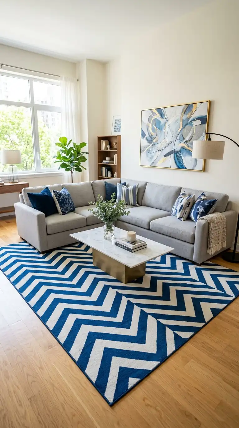 A geometric rug in blue and white patterns adds contemporary energy and crisp contrast to a living room. The clean lines and bold shapes create visual interest without overwhelming the space. Pair it with modern furniture in neutral tones—gray, white, or black—and incorporate blue accents in pillows or artwork to tie the look together.