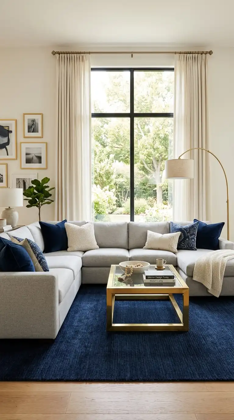 A navy blue rug paired with a gray sectional creates a sophisticated, grounding foundation for a living room. The combination feels balanced and timeless, with the deep blue adding richness while the gray keeps the space neutral. Add metallic accents in gold or brass to introduce warmth and elevate the overall aesthetic.