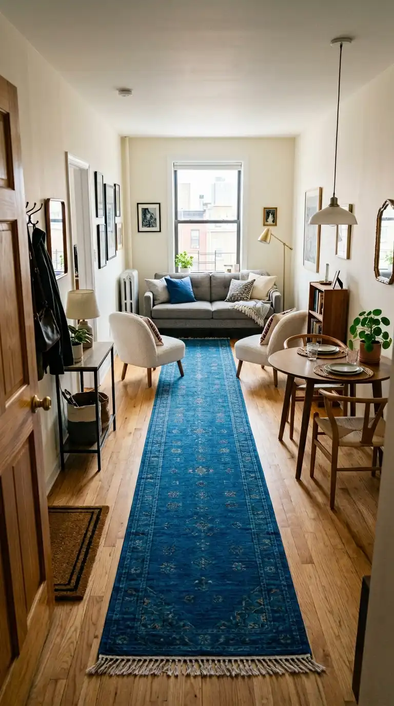 In narrow or long living rooms, a blue runner rug can define the space and add color without overwhelming the floor plan. Use the runner to create a visual pathway or to anchor a specific seating area. Pair it with neutral furniture and add blue accents throughout to create cohesion.