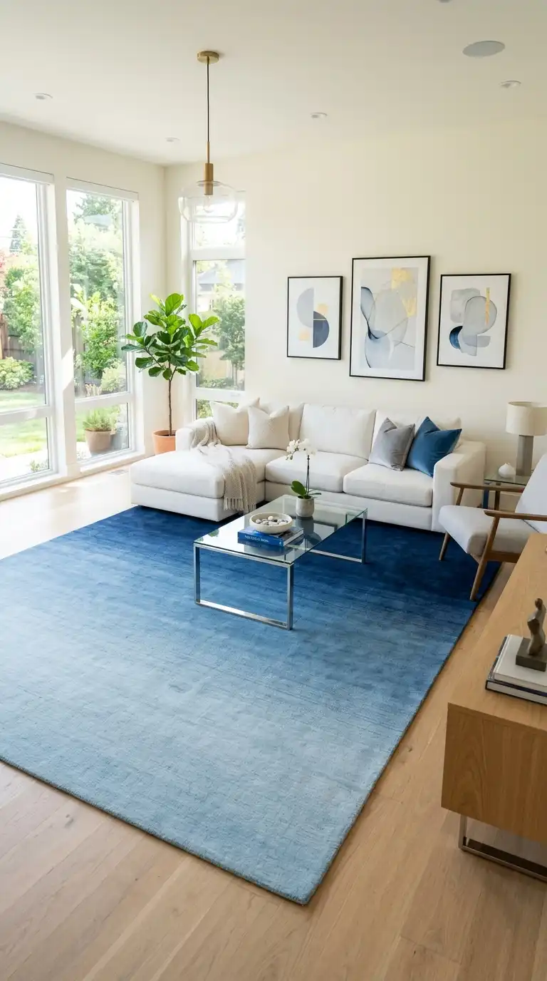 For a standard living room, choose a rug large enough to fit under the front legs of all seating pieces. Ideally, the rug should extend at least 6 to 12 inches beyond the sides of the sofa and chairs. For a cohesive look, all furniture should sit entirely on the rug or at least have the front legs on it. - How do I choose the right shade of blue for my rug?
