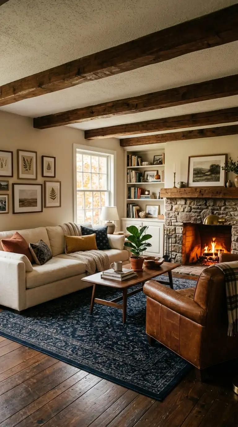 A dark blue rug provides a rich, grounding foundation that allows warm wood tones to shine. The contrast between the cool blue and warm wood creates balance and visual interest. Use wood furniture in oak, walnut, or teak, and incorporate leather or woven textures for added warmth.