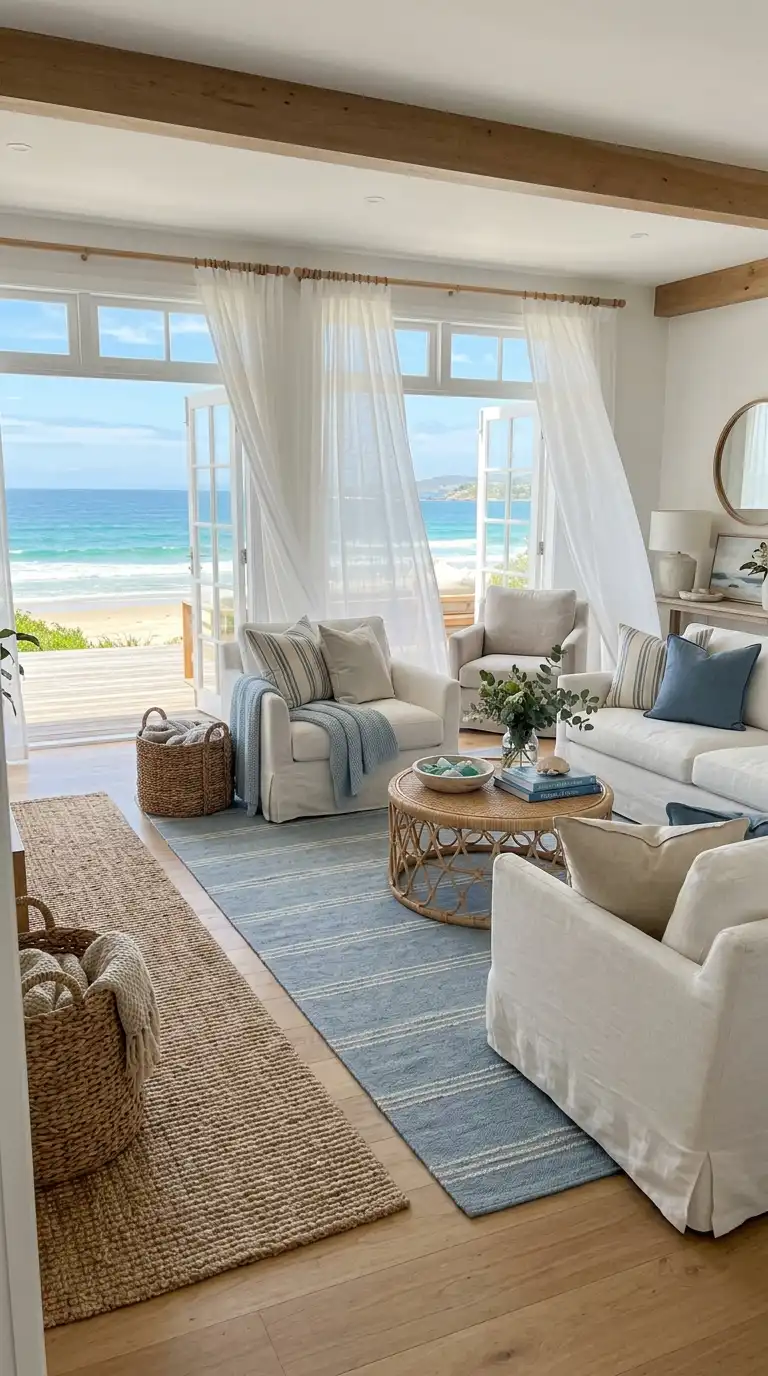 A coastal-inspired blue rug in a soft, weathered shade sets the tone for a relaxed beachy living room. Pair it with white slipcovered furniture, natural wood accents, and plenty of texture through jute, rattan, and linen. The combination feels fresh, airy, and effortlessly inviting, evoking the calm of the seaside.