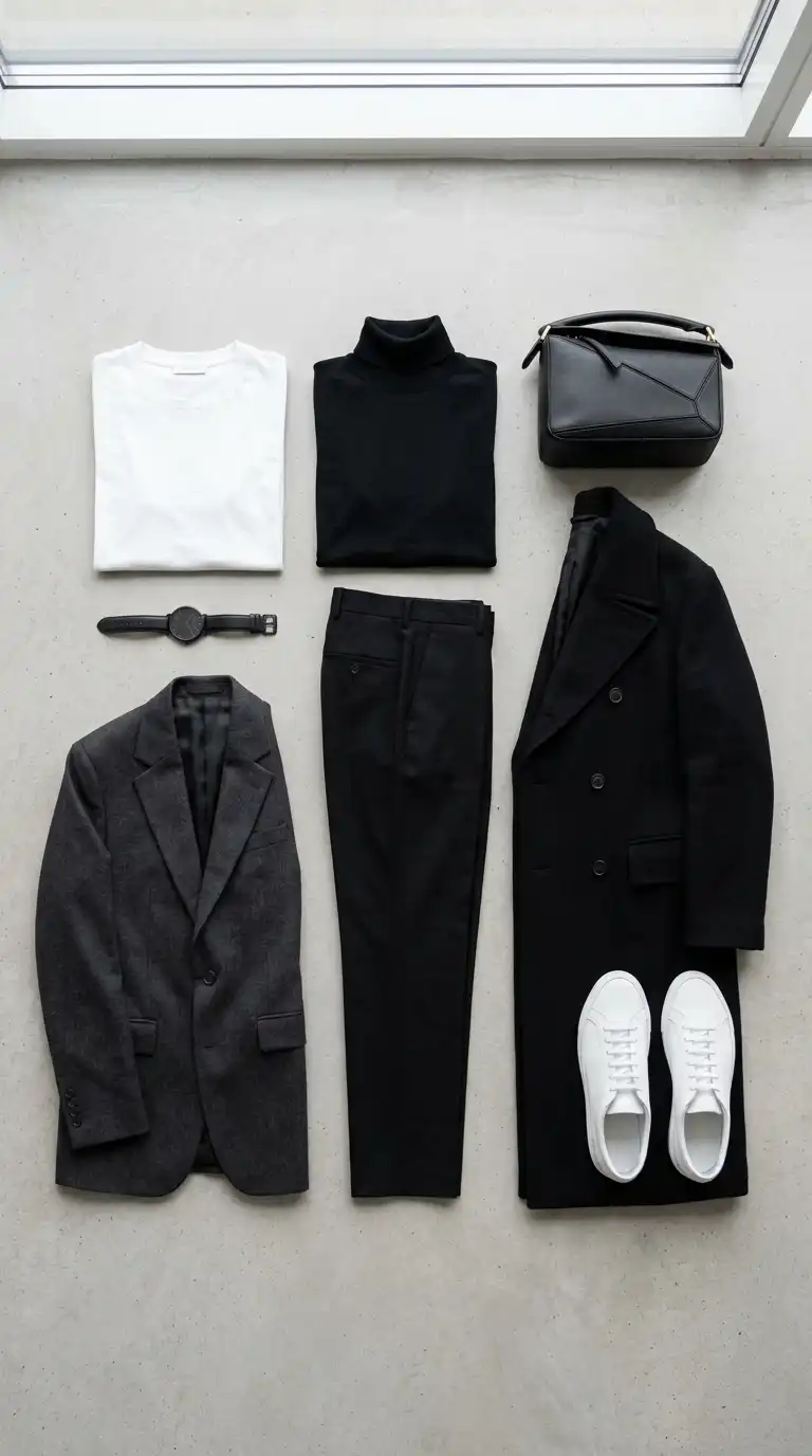 The modern minimalist capsule embraces clean lines, architectural silhouettes, and a restrained palette of black, white, and charcoal. Key pieces include a crisp white t-shirt, a black turtleneck, tailored black trousers, a structured blazer, and a wool coat. Fabrics are luxurious—cashmere, wool, crisp cotton—and silhouettes are sharp and intentional. Accessories are sleek: leather sneakers, a minimalist watch, and a structured handbag. This capsule is ideal for those who appreciate a streamlined aesthetic and prefer a wardrobe that feels both functional and fashion-forward. Every piece is chosen for its ability to stand alone or layer seamlessly.