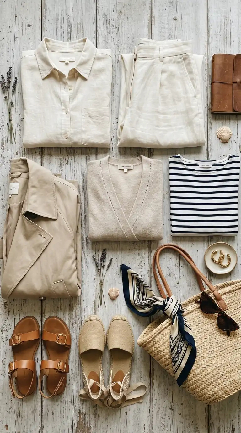 The elevated basics capsule takes everyday essentials to the next level with refined silhouettes, premium fabrics, and thoughtful details. The palette focuses on cream, navy, olive, and soft white. Key pieces include a silk tank, tailored linen trousers, a cotton-blend blazer, a cashmere-blend t-shirt, a midi skirt in a neutral tone, and a lightweight trench coat. These pieces offer polish without formality, making them ideal for work, travel, and weekend wear. Footwear includes leather loafers, block-heel sandals, and minimalist sneakers. Accessories are sleek and understated.