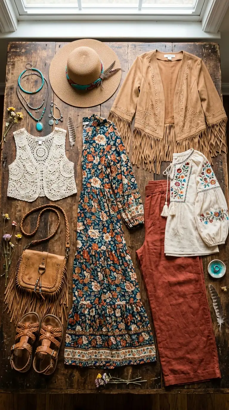 The bohemian spirit capsule embraces pattern, texture, and free-spirited style. The palette includes warm earth tones—terracotta, rust, olive, cream, and turquoise—with mixed prints like floral, paisley, and geometric. Key pieces include a flowing maxi dress, an embroidered peasant top, wide-leg trousers, a crochet vest, and a fringed kimono. Fabrics are natural—cotton, linen, suede—and textures are layered for depth. Accessories include leather sandals, layered necklaces, a suede fringe bag, and a floppy hat. This capsule encourages creative expression and is perfect for those who love pattern, color, and artisanal details.
