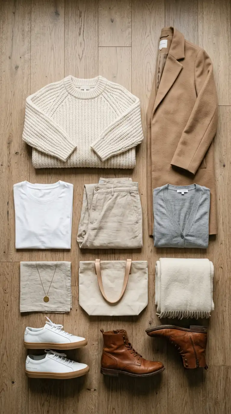 Scandinavian design principles—simplicity, functionality, and warmth—inform this capsule. The palette is light and airy: white, cream, pale gray, and soft beige, with touches of muted pastel. Key pieces include a chunky knit sweater, relaxed-fit trousers, a simple white t-shirt, a lightweight cardigan, and a wool coat. Silhouettes are relaxed but intentional, with an emphasis on comfort and natural materials. Footwear includes minimalist sneakers and leather boots. Accessories are understated—a simple pendant necklace, a canvas tote, and a wool scarf. This capsule embodies cozy minimalism, perfect for those who value comfort and simplicity.