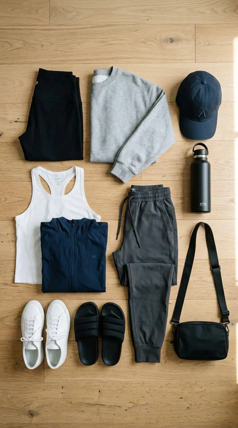 The athleisure capsule combines comfort and style for active lifestyles. The palette includes black, gray, navy, and pops of coral or mint. Key pieces include high-waisted leggings, a relaxed-fit sweatshirt, a performance tank, a lightweight zip-up jacket, and jogger-style trousers. These pieces transition from morning workouts to casual errands to weekend travel. Footwear includes white sneakers, slides, and supportive trainers. Accessories are functional yet stylish—a baseball cap, a crossbody sport bag, and a sleek water bottle. This capsule is perfect for those who prioritize comfort without sacrificing style.