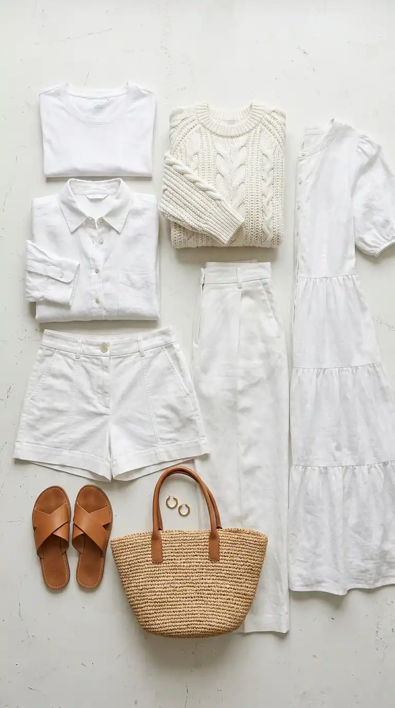 A monochrome white capsule is the ultimate expression of simplicity and elegance. Crisp, clean, and endlessly versatile, an all-white wardrobe creates a serene foundation that feels both modern and timeless. Key pieces include a white t-shirt, white linen button-down, white tailored shorts, white wide-leg trousers, a white midi dress, and a white knit sweater. The focus is on texture—combine linen, cotton, silk, and knit for depth and interest. Accessorize with tan leather sandals, a woven bag, and gold jewelry to add warmth. This capsule is perfect for those who appreciate a minimalist aesthetic.