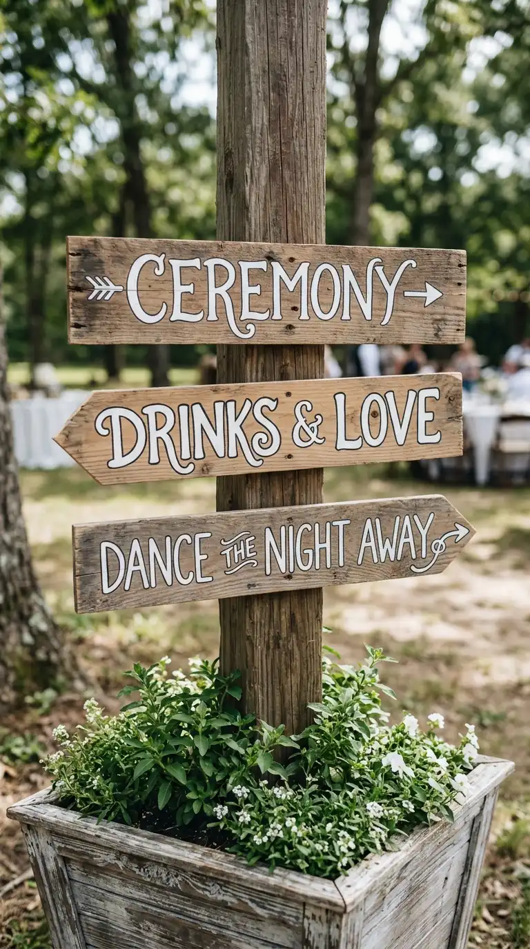 Help your guests navigate and set the tone from the moment they arrive with personalized signage. Use scrap wood (pallet wood works great here, too!) and some leftover paint to create arrows pointing to the ceremony, the “bar,” the “dance floor,” and the “restrooms.” You can use freehand calligraphy for a bohemian touch or use stencils for a cleaner look. These signs are functional, charming, and add an instant personalized touch that store-bought signs just can’t match.