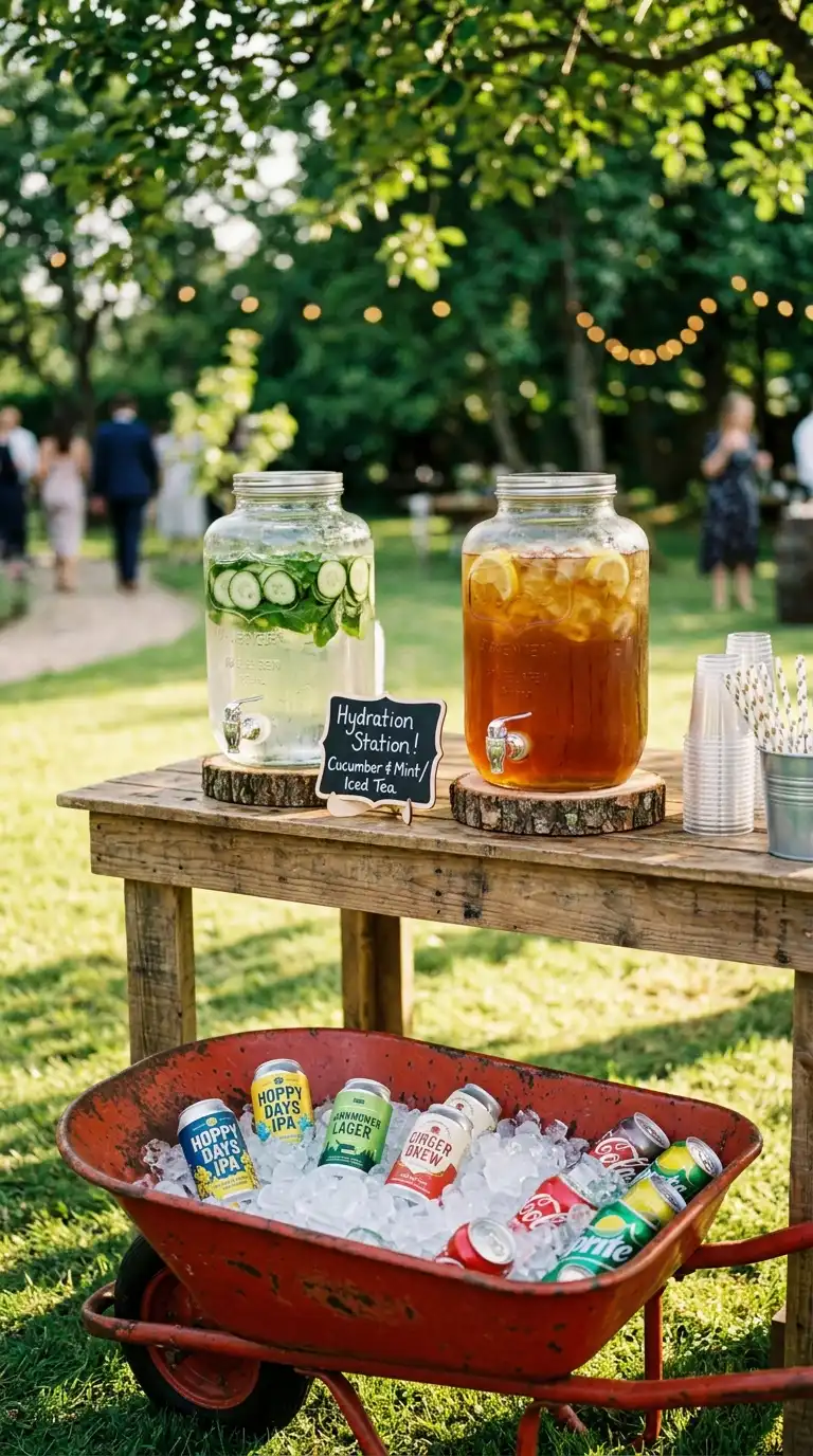 A formal bar can be a major cost. A DIY station can be far more memorable and budget-friendly. For non-alcoholic drinks, use large, self-service beverage dispensers filled with infused water, lemonade, or iced tea. For alcoholic beverages, a wheelbarrow filled with ice and a variety of canned/bottled drinks is iconic for a backyard wedding. For a quirky, vintage twist, an old (clean!) clawfoot bathtub filled with ice can hold a lot of beverages in style.