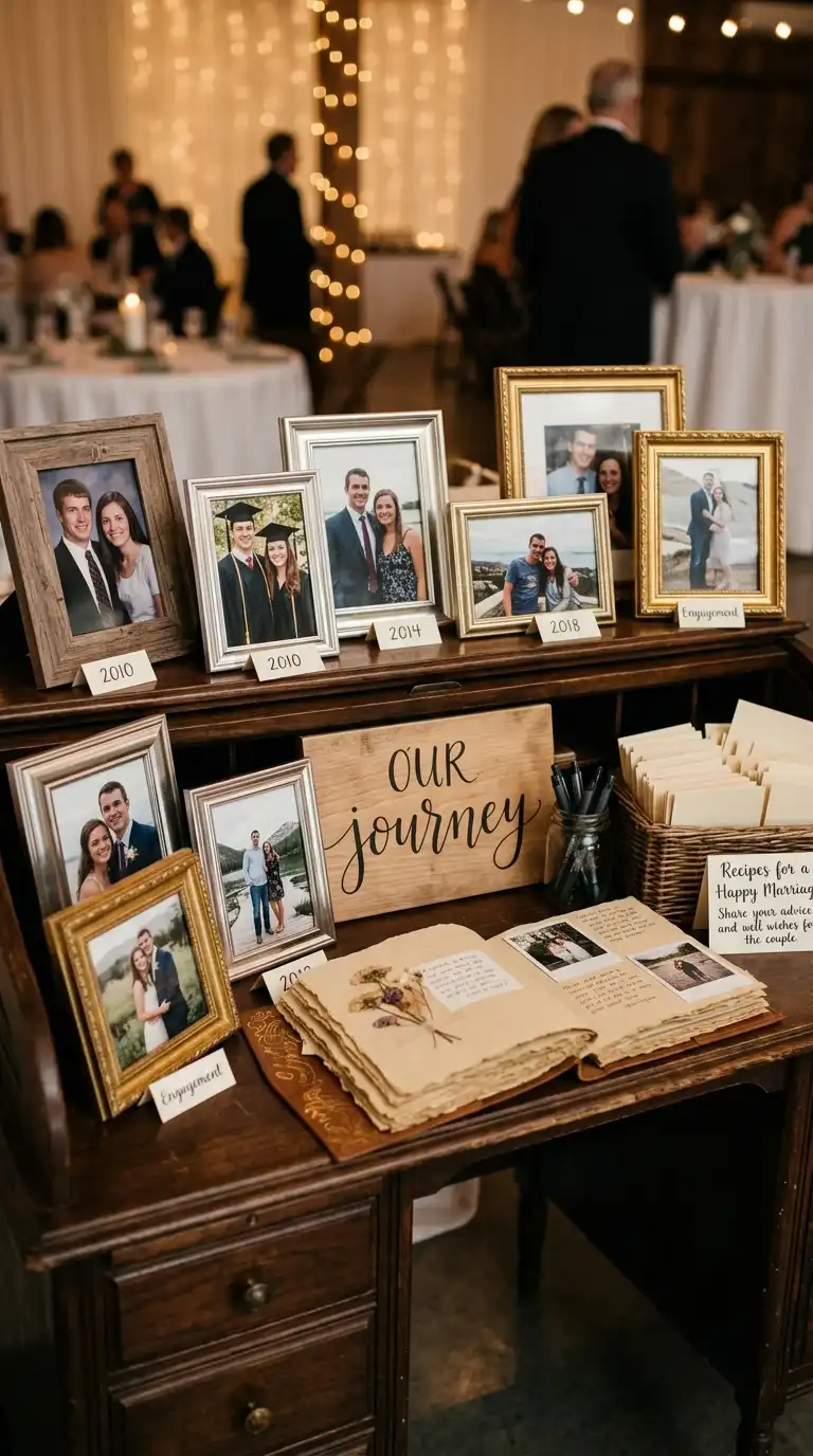 Instead of a formal guest book, create a dedicated table that shares your journey with your guests. Scatter a collection of photos of you two over the years (casual snapshots, not just engagement photos). Include small framed stories of your first date, your favorite trip, and how you met. Place a scrapbook, a box of recipe cards for “recipes for a happy marriage,” or even just a beautiful notebook for guests to write their well-wishes and advice. This is deeply personal, costs next to nothing, and guests love the window into your relationship.