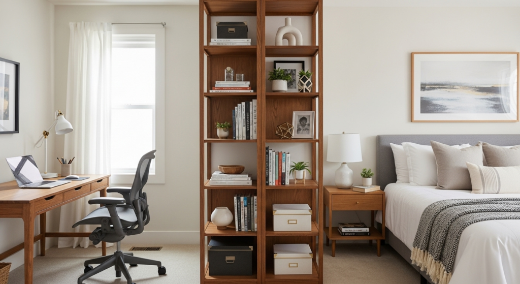 - Bookshelf separating zones visually