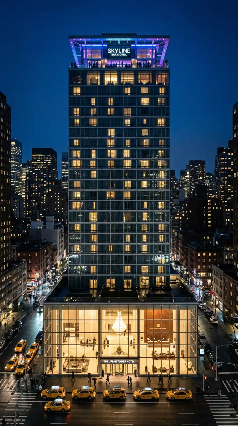 The urban tower hotel is a tall building in a city centre. The ground floor has a grand lobby. The middle floors have guest rooms. The top floors have a restaurant, bar, and observation deck. The urban tower hotel is vertical, efficient, and skyline-defining.
