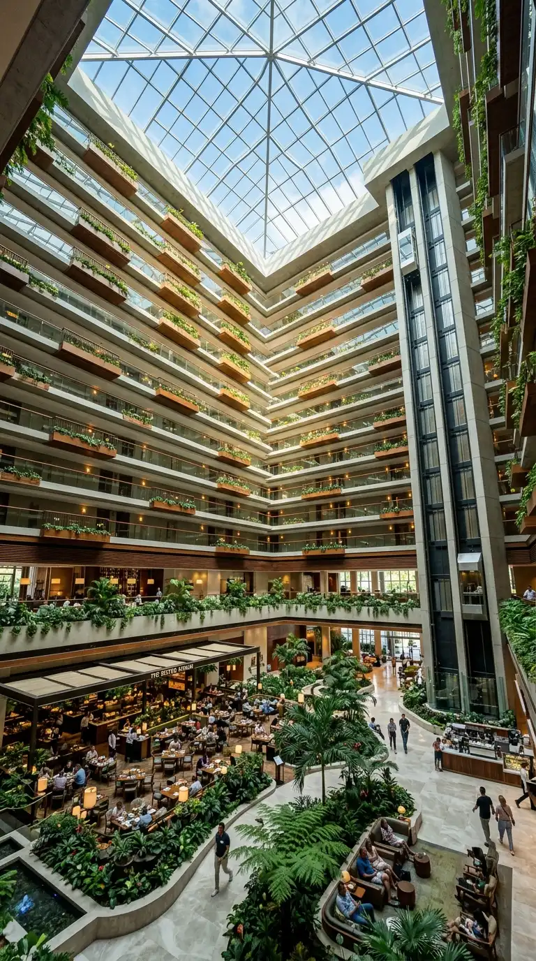 The atrium hotel has a large central atrium open to the sky, surrounded by guest room balconies. The atrium is the heart of the hotel — a lobby, a lounge, a restaurant, a garden. Light enters from above. The atrium hotel is luminous, vertical, and communal.